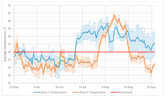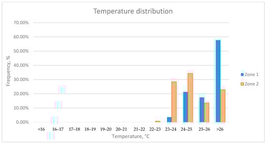 In addition to the average profile, a frequency analysis, shown in Figure 9, was done for the temperatures lower than 20 °C, higher than 26 °C, and every degree in between. On the graph, it can be seen that for each zone there are two high frequency temperature peaks: at 24–25 °C denoting night and above 26 °C indicating day temperature. In Zone 1, the temperature is above the limit of 26 °C for 57.7% of the time, while in Zone 2, the temperature is within the comfortable range of 23–25 °C during 62.8% of the summer period, indicating a more comfortable thermal environment.
