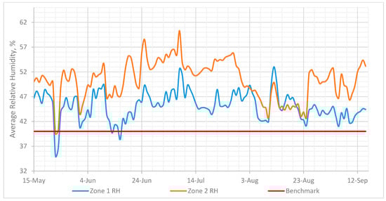 The air temperature profiles as well as the relative humidity data were analyzed using the daily average from several sensors in the same room (4 in Zone 1 and 2 in Zone 2). According to CIBSE guide A [40], “in well insulated rooms and away from direct radiation from the sun or from other high temperature radiant sources, the difference between air and the mean radiant temperatures (and hence between the air and operative temperatures) is small”. The on-site measurements, done by Dawe et al. [74] and Walikewitz et al. [75], also show that in the absence of a radiative heat source or sink (e.g., radiative heating or cooling system, windows facing south-east and south-west), the air temperature can be used as an estimation of radiant and consequently operative temperature as the difference is around 0.4–0.5 K. Based on that, it can be assumed that the operative temperatures in the CSET building are in proximity to the measured air temperatures. The results are summarized in Figure 7. The horizontal benchmark line represents the maximum summer indoor temperature limit established by the Chinese standard [41]. Starting from the beginning of summer the average temperatures in both zones met the requirements of the standard up until the 8th of July, when Zone 1’s temperatures gradually increased above 26 °C, followed by Zone 2’s ambient air temperature rising on 28 July. While in Zone 1 the indoor environment consistently stayed uncomfortably hot throughout the rest of the summer, average temperatures in the Zone 2 fell below the higher limit on the 25 of August and remained comfortable for the rest of the measurements. It can also be seen from the graph that Zone 1 mostly had higher temperatures than Zone 2, with the longest exception starting from 5 August and ending on 22 August. Additionally, the Zone 1 thermal environment maintained relatively stable temperatures, while in Zone 2, the graph has more peaks and spikes. The relative humidity levels presented in Figure 8 mostly stayed in the comfortable range specified by the design standards with the tendency to be closer to the lower limit. Overall, the environment was drier in Zone 2 with two days average RH dropping below specified 40%—23 May and 16 June.