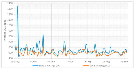 Similarly to the temperature analysis, the daily average (shown in Figure 10) and frequency distribution graph for CO2 gas concentration levels lower than 400 ppm, higher than 1000 ppm, and every 100 ppm in between (shown in Figure 11) were developed. From these graphs, it can be said that Zone 1 CO2 levels tended to be higher than in Zone 2, with the majority of daily average points being located within the range of 500–600 ppm, some surpassing 600 ppm and one, on the 18th of May, exceeding the half a day limit established by the standards—1000 ppm. This peak was theorized to be attributed to the open-door day when meetings with outside visitors were held. Based on the frequency distribution graph for Zone 2, the most common readings were in a range between 400 and 500 ppm.