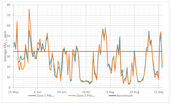 Figure 12 describes PM2.5 concentration levels averaged for a day in Zone 1 and Zone 2. Jantunen et al. [76] state that the main sources of fine PM indoors are outdoor air and indoor combustion of solid fuels for heating and cooking. The graph shows high homogeneity of the points for each location indicating that the levels of this specific contaminant are dependent on the outdoor air. The Chinese standard for indoor air quality [56] does not specify any limits for PM2.5, therefore the ambient air standard [77] was used to evaluate the indoor PM2.5 levels. Overall, PM2.5 concentrations usually were slightly higher in Zone 2 than in Zone 1, with the majority of measured points being below the established limit of 35 ppm. However, on some days, PM2.5 levels went above 50 ppm. Comparing Figure 10 and Figure 12, it can be seen that the highest peak values for CO2 and PM2.5 were in different days, which can be explained by different sources of these contaminants. Considering the currently used fresh air supply system in CSET, the indoor air quality (judging only by these two contaminants) can only be as good as the outdoor air is. Thus, in order to improve the current and future indoor air quality, air filters are suggested to be installed.