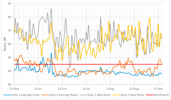 For the indoor noise levels, the Chinese code for design of sound insulation of civil buildings specifies that the allowed sound level in a common teaching room and a computer room should be equal to or less than 45 dB (the benchmark in Figure 13). Overall, the daily average noise levels in Zones 1 and 2, presented in Figure 12, varied between 35 and 52 dB, with Zone 1 sound levels being considerably lower than in Zone 2 for around half of the data. The sound environment in Zone 1 met the requirements outlined in the Chinese code [55] almost throughout the measurement periods. Zone 2 noise levels exceeded the 45 dB limit in May, for 5 days in the middle of June, occasionally in August, and starting from the 13th of September. As for the maximum sound levels, they greatly surpassed the established limit with the majority of the Zone 2 points being below the Zone 1 ones. While these maximum noise level points were affected by occasional events such as a rapidly closed door or a ringing phone, they do not represent the typical sound environment in the building. However, it is important to notice that the maximum peaks for Zone 1 are different than those of Zone 2, which means that the noises in one room did not affect the indoor environment of the other.
