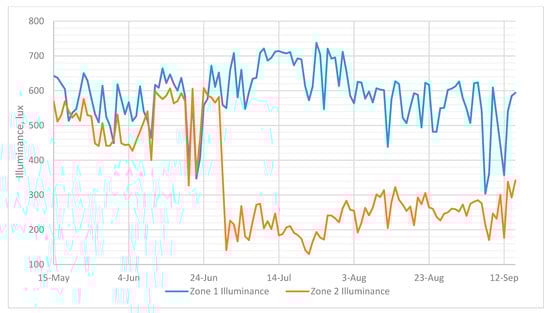 In order to analyze the illuminance levels in the building, an average for the teaching hours from 9 a.m. until 9 p.m. was taken for each day. This method allows to evaluate the natural light penetration into the building and artificial lighting levels in hours close to and after sunset. All the data below 250 lux after 5pm were excluded from the analysis to prevent the measurements during hours when the building was unoccupied and lights were turned off from influencing the results. As it is shown in Figure 14, the illumination levels near the sensors located in Zone 1 were well above 500 lux—the drawing room standard limit for almost all summer days indicating very high incoming natural lighting. In Zone 2, however, the sensors consistently detected lower illuminance levels with a sharp drop on the 29th of June followed by illuminance levels being in a range of 100–300 lux until the 13th of September. This drop was theorized to be caused by the occupants’ choice to close the curtains in order to prevent the direct sunlight and glare in the zone.