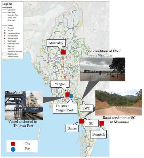 - Japan International Cooperation Agency. Data Collection Survey on National Logistics in Republic of the Union of Myanmar. 2018. Available online: https://openjicareport.jica.go.jp/728/728/728_104_12305694.html (accessed on 3 May 2020).