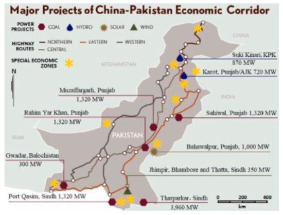 CPEC is a multi-sectoral project at the Western coast of Gwadar, Baluchistan that links all the provinces of Pakistan with roads, pipelines, railway tracks, energy infrastructure and industrial projects, as well as with other sub-projects in communication, health, education, and transportation [22]. The project will also help Pakistan to develop its energy resources along the CPEC route [23], and it will be extended to the other neighboring countries like Afghanistan and other central Asian countries. Three routes are proposed for CPEC in Pakistan: The eastern route will pass mainly through the provinces of Punjab and Sindh [24], while the second route, called the central route, encompasses Khyber Pakhtunkhwa and some underdeveloped areas in Punjab and the Sindh province. The third western route travels rural areas of Baluchistan with Khyber Pakhtunkhwa [25].