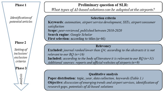 Systematic literature review (SLR) is an exploratory research process to synthesize and critically estimate enquiries into a specific topic according to a pre-defined perspective [45]. Existing research has been collected to identify research gaps, which demand more attention and determine our empirical research plan. Our literature review aims to interpret the basic characteristics of emerging technologies and their relevance in airport service development. As Figure 1 shows, the SLR process comprises three phases, which begin with a systematic search. The first step was criteria selection, in which keywords (n = 4), scope of the research (peer-reviewed, published in the last ten years), and database (Google Scholar) were selected. According to titles, research yielded a total of 46 relevant sources. In the second phase, the number of relevant articles was decreased by the exclusion criteria. Finally, 31 relevant sources were identified and analysed qualitatively. Information published on the official website of each airport was also used for the analysis (n = 9).