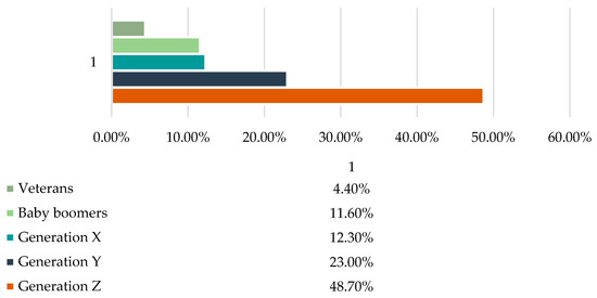The age distribution of the respondents was determined according to the generational marketing theory [50] which distinguishes five categories (Figure 2.). Based on age groups, the dominance of Generation Z (digital natives) and Generation Y (millennials) can be seen (71.70% of the total sample) (Figure 3).