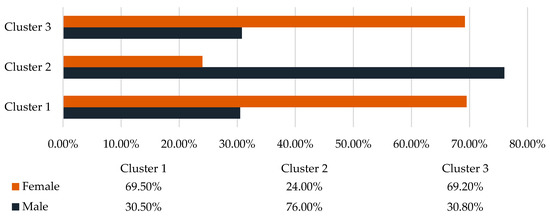According to genders, the first and the third clusters are dominated by female respondents (Figure 5). The second cluster has the highest proportion of male respondents (76.0%). To determine the correlation between variables, the χ2 test was performed.