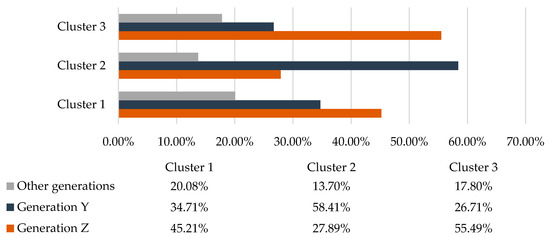 According to generation variable, the dominance of the Z and Y generation respondents can be observed in all clusters. Therefore, we examined how the distribution of these two age groups changes within the clusters (Figure 6). We can see that in the first cluster the ratio of the two age groups is quite balanced, and the role of the Z generation is slightly larger. The second cluster shows the dominance of the Y generation age group, while the third cluster shows a large potency of the Z generation.