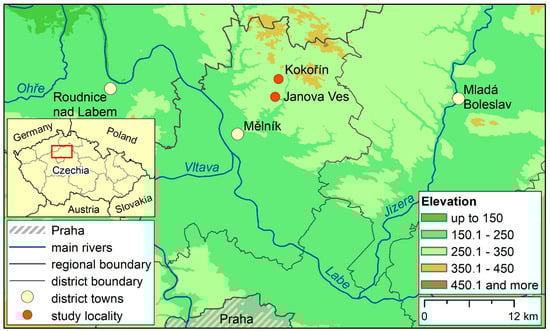 Both of the studied villages, Kokořín and Janova Ves, situated 1 km from each other, are found in Central Bohemia about a 20 min drive from the local administrative and urban centre Mělník (population 19,500) and a 50 min drive from the capital city Prague (population 1.3 million). Geographically, from the urban–rural continuum perspective, the locality is intermediate rural, i.e., it is located on the outskirts of the Metropolitan Area of Prague (see Figure 1), has a relatively stable population, and still maintains its rural character (as regards its physical appearance). Therefore, for the purpose of our research, the locality can be viewed as a typical Czech rural area. On the one hand, it has not gone through suburbanization or other counter-urbanization processes with the associated in-migration of urban middle-class residents. On the other hand, it does not represent peripheral rural areas with a dominant occurrence of low-income and older residents, long travel distances, and a higher risk of social exclusion. Therefore, it can be viewed as a semi-periphery within the Czech context.