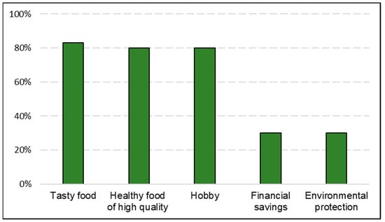 The motivations for growing vegetables and fruit are summarised in Figure 3. Respondents were asked to choose all relevant motivations from five options offered to them. Tasty food (83%), healthy, and high-quality food and as a hobby (both 80%) were seen as the most important with financial savings and environmental protection (both 30%) seen as less important. Below, we list some quotes from the interviews related to taste, health, quality, and hobby motivations. Financial and environmental aspects are included later in the text, along with answers to other similar questions. Quality and health motivations were illustrated by their criticism of conventional agriculture and sometimes linked to the health of their children and their need to know the origin of their food. Additionally, in the case of tomatoes and strawberries, the lack of taste of fruit from shops was also stressed.