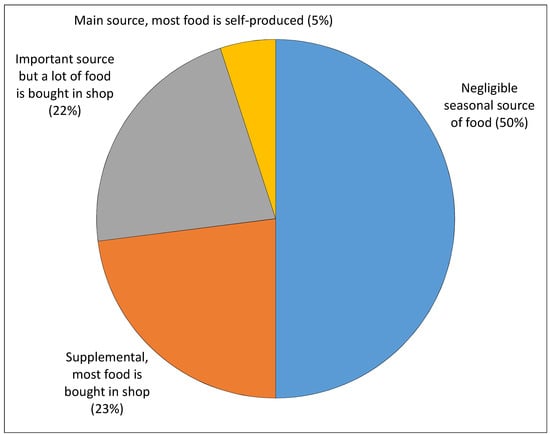 Despite the high frequency of gardening, this activity still has an economically supplemental character for most of the households, as Figure 4 shows. Their own food production was only a negligible seasonal source of food for half of the respondents, while being a supplemental or important source for approximately a quarter, respectively. Only 5% of respondents reported that their own production of food was their main source of food. Respondents’ gardens were not the only source of food for any of them; all of them (including households consuming the highest share of self-produced food) still shopped regularly in supermarkets (100% of respondents). Other shopping places included small grocery stores (58%), direct shopping from producers (30%), and farmers’ markets (18%).