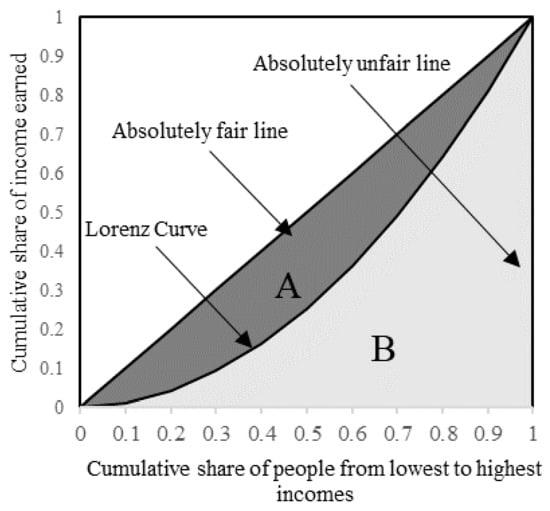 The Gini coefficient is an indicator proposed by the Italian economist Gini at the beginning of the 20th century to measure the fairness of distribution, which is based on the idea of the Lorenz curve. It takes the value of the area A, enclosed by the actual Lorenz curve, and the absolute fairness line in the proportion of the area A+B between the absolute fairness line and the absolute unfairness line, and the value is between 0 and 1, as shown in Figure 1.