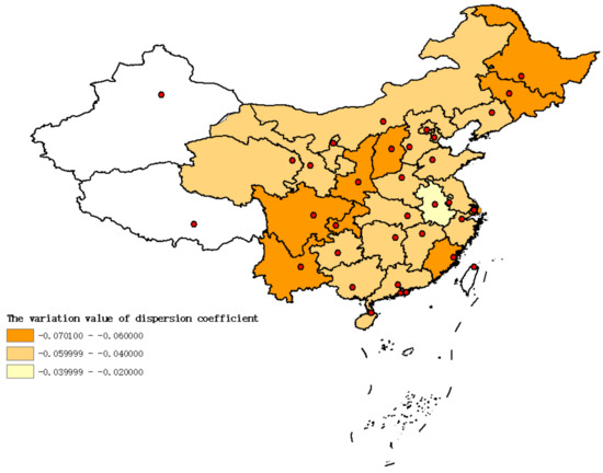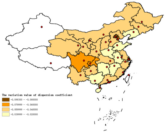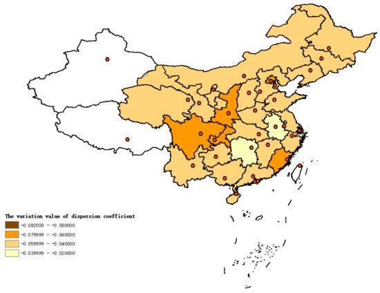 As shown in Table 5, all the variation values of dispersion coefficients are negative. In the Figure 2, Figure 3 and Figure 4 below, the darker the color of a region is, the greater the absolute value of the variation value of the dispersion coefficient is, which means that the income redistribution effect of pension in the region is stronger. Under different overall planning levels and calculation and payment paths, the variation value of the dispersion coefficient of each region will change. Correspondingly, the color displayed in the figure in each region may also change, symbolizing the transition and change of the level of pension income redistribution effect.
