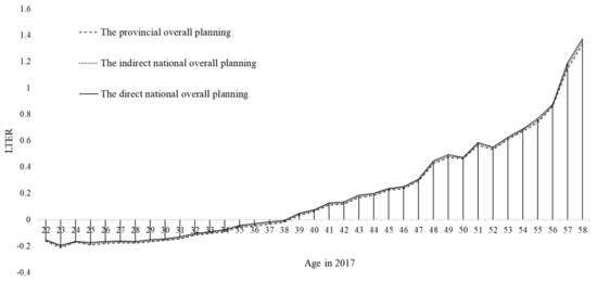 According to Figure 3, Figure 4 and Figure 5, the horizontal axis of the coordinate represents the age of the insured in 2017, and the vertical axis represents the lifetime net benefit rate of the pension. The curve describes the corresponding relationship between the age of the insured and the lifetime net benefit rate of the pension. It can be seen that the three curves intersect the horizontal axis at about 38 years old, which means that the present value of lifetime contribution and the present value of receipt of pension for the insured group aged 38 or so in 2017 are basically equal, while the insured group under 38 years old is the welfare outflow of the system. It can be seen that 1–20% of their wage income will be transferred to the insured group of previous generation through the basic endowment insurance system. At the same time, the insured over 38 years old can often get 1–140% pension benefits in their lifetime. With the improvement of the overall planning level and the strengthening of the intensity of the pension, the curve is moving upward, which indicates that the pension net benefit rate of the on-the-job insured groups of all ages will be improved. At the same time, it also makes the age coordinate of the curve crossing the horizontal axis move forward, which means that the age group with negative net benefit rate is shrinking continuously. It shows that compared with the current provincial overall planning, the reform of national overall planning will reduce the number of young people suffering from welfare damage. Therefore, raising the overall planning level of basic endowment insurance can not only benefit the whole age group, but also protect the pension benefits of more young generation of insured.