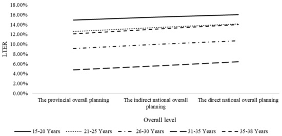 In order to further consider the relationship between the changes in the redistribution effect of the increase in pension overall planning levels and the number of payment years, we calculated and obtained Table 10. According to the current methods of receiving basic pension insurance, the insured must meet the condition of “cumulative payment period of 15 years” after retirement to receive the pension. If the payment period is less than 15 years, the pension can be made up one time at the time of retirement. Therefore, in this paper, individuals whose cumulative working years are less than 15 years are treated as 15 years of payment. Because the starting working age of the statistical sample is set at 22 years old, according to the retirement age of 60 years, the maximum number of years of payment for statistical samples is 38 years. As shown in Figure 6, with the improvement of the overall planning level and the strengthening of the intensity, the net benefit rate of the insured groups with different payment years will increase. However, under the three methods of the calculation and payment, the group with the highest average net benefit rate is the group with the payment duration of 15–20 years, and the group whose payment period is 31–35 years is the lowest. Therefore, in order to obtain the maximum lifetime net benefit, the payment period should be controlled between 15 and 20 years. At the same time, policy makers should pay more attention to the group whose payment period is about 30 years, increase welfare compensation and narrow the benefit gap with other groups.