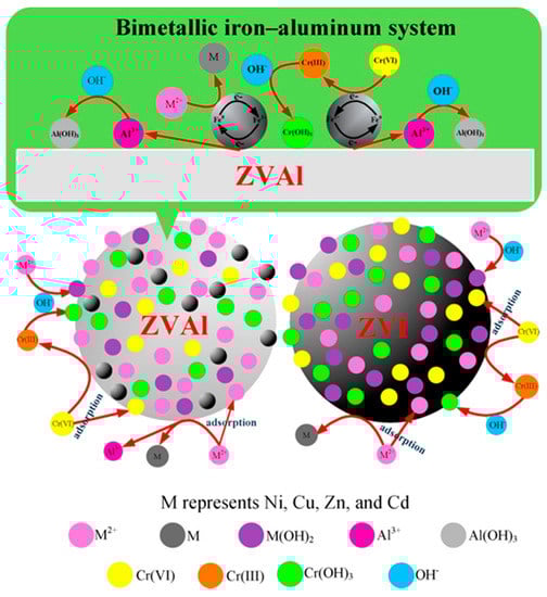 - Han, W.; Fu, F.; Cheng, Z.; Wu, S. Studies on the optimum conditions using acid-washed zero-valent iron/aluminum mixtures in permeable reactive barriers for the removal of different heavy metal ions from wastewater. J. Hazard. Mater. 2016, 302, 437–446. [Google Scholar] [CrossRef]