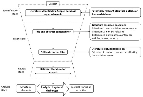 This literature study focused on analyzing elements that affect the maritime innovation process, especially concerning the maritime energy transition. The main sectoral scope considered shipping (including port activities) and shipbuilding within the context of the European economic area, as clarified in Section 2.1. We apply a systematic review in which we ‘bring together as many studies as possible relevant to the research, irrespective of their published location, or even disciplinary background’ [19]. We are interested in any factor linked to innovation and adaptation to sustainability in the maritime sector. A broad search was performed aimed at maritime innovation. In Figure 1, we illustrate the various steps involved. These are explained in the following paragraphs.