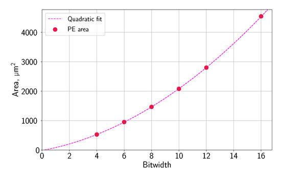 With the calculations that are shown in Equations (3) and (4) we can estimate the number of PEs that can be placed on the silicon. Table 2 summarizes the results for different bitwidths, calculated while using data from Figure 1.