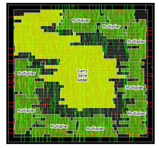 Our kernel 8-bit processing engine (PE) layout using TSMC 28 nm technology. The carry-save adder can fit 12-bit numbers, which is large enough to store the output of the convolution.