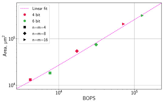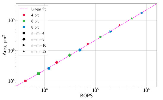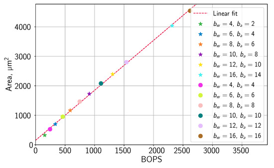 In the systolic design, we generated three square arrays of , , and PEs, with . The systolic array area was found to be in linear relation with BOPS, with the goodness of fit , as shown in Figure 12.