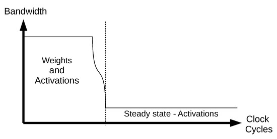 Note that, until the weights and the first activations are loaded, no calculations can be performed. The pre-fetch stage’s overhead bandwidth can be mitigated by doing work in larger batch sizes, loading the weights once, and reading several inputs for the same weights. Therefore, we minimize the penalty for reading the weights as compared to reading the actual input data to perform the calculation. However, in the case of real-time processing, larger batches are less feasible, because the stream of data needs to be computed on-the-fly. An alternative solution is to use local memory (SRAM) for storing partial results, weights, and fetched activations for the next cycle of input data. However, the required amount of SRAM may not be available or significantly limit the amount of PEs that can be placed on the same silicon area. This problem is especially relevant in the IPs used as a part of SoCs, which have a highly limited amount of area. The trade-off of available area versus the achievable performance is one of the most important issues in SoC design.