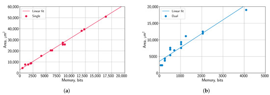 Local memory is used in order to store the weights or activations for further re-use instead of fetching them repeatedly from the main memory. Recently, accelerator designers started to increase the amount of local memory [17,18] in order to fit all of the parameters and avoid using external memory during inference. While this allows for us to avoid memory bottlenecks, local SRAM usage requires a significant amount of resources. Nevertheless, even small amounts of SRAM can be used as cache to reduce the effective memory bandwidth by storing some input data. The trade-off between the area allocated to local SRAM area and to PEs should be carefully evaluated for each design. SRAM area is almost linear to the amount of bits used, with goodness of fit and for single-port RAM and dual-port RAM, respectively, as shown in Figure 6. Thus, this linear relation can be used in order to accurately estimate the local SRAM area just from the number of bits.