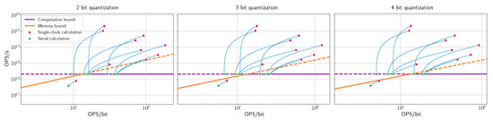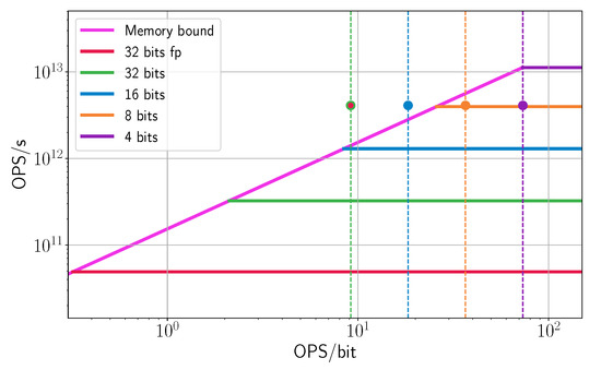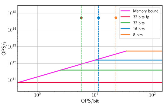 Both of the examples demonstrate that decisions made at early stages have a critical impact on the quality of the final product. For example, applying aggressive quantization to the network or increasing the silicon size may not improve the overall performance of the chip if it is bounded by memory. From the architect’s point of view, it is important to balance computation and data transfer. Nonetheless, this balance can be achieved in different ways: at the micro-architecture level, at the algorithmic level, or by changing the data representation. The architect may also consider: (1) changing the hardware to provide faster communication (which requires more power and is more expensive), (2) applying communication bandwidth compression algorithms [40,41], (3) using fewer bits to represent weights and activations (using 3- or 4-bit representation may solve the communication problem, at the cost of reducing the expected accuracy), or (4) changing the algorithm to transfer the data slower (even though that solves the bandwidth issue, the possible drawback is reduced throughput of the whole system). The proposed OPS-based roofline model helps the architect to choose between alternatives. After making major architectural decisions, we can use BOPS in order to estimate the impact of different design choices on the final product, such as the expected area, power, optimal operational point, etc.