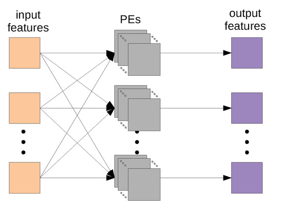 We start the evaluation with a review of the use of BOPS as part of the design and implementation process of a CNN accelerator. This section shows the trade-offs that are involved in the process and verifies the accuracy of the proposed model. Because PEs are directly affected by the quantization process, we focus here on the implementation of a single PE. The area of an individual PE depends on the chosen bitwidth, while the change in the amount of input and output features changes both the required number of PEs and size of the accumulator. In order to verify our model, we implemented a weight stationary CNN accelerator, which reads the input feature for each set of read weights and can calculate n input features and m output features in parallel, as depicted in Figure 10. For simplicity, we choose an equal number of input and output features. In this architecture, all of the input features are routed to each of the m blocks of the PEs, each calculating a single output feature.