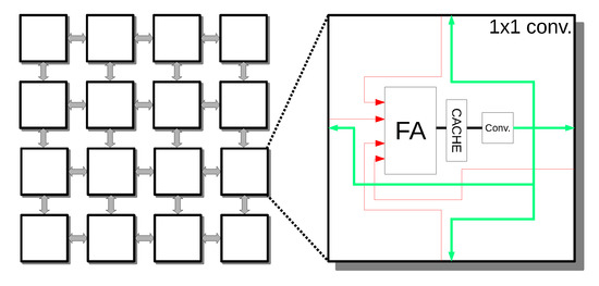 In order to verify the applicability of BOPS to different topologies, we also implemented a systolic array that is shown in Figure 11, where each PE is connected to four neighbors with the ability to bypass any input to any output without calculations. The input feature accumulator is located at the input of the PE. This topology generates natural PEs, but. with proper control, it is possible to create flexible accelerators.