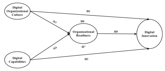 Thus, the organizational digital culture and capability play a critical role for the organizational readiness toward a new business model [,]. There is no doubt that these constructs gain importance for the direction of the digital innovation. However, it is not enough to improve the digital innovation directly with the organizational digital culture and capability. The existing studies suggested various factors that are the outcomes of the organizational digital culture and capabilities, and at the same time, they positively influence the digital innovation. One of the major outcomes of both digital culture and organizational capabilities is the organizational readiness that consecutively affects the digital innovation [,]. Therefore, in this study we highlight this gap and explore the mediating role of organizational readiness between the organizational digital culture, digital capabilities, and digital innovation link. The term organizational readiness represents a firm ability to adjust their available resources for the effective adoption, exploitation, and assimilation of the digital technologies, which supports the implementation of the innovative activities []. In the current study, we posit that both organizational digital culture and digital capabilities support the adjustment of the organizational resources with the emerging technologies, which ultimately determine the enhancement of the digital innovation. In the current study we hypothesize the mediating effect of the organizational readiness between the digital organizational culture and digital innovation, as well as between the digital capabilities and digital innovation.