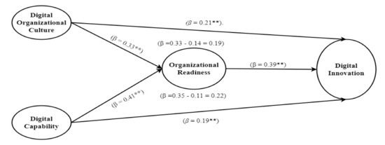 Furthermore, for supporting Hypothesis 3, Model 2 from Table 3 provides the findings of the direct effect of the digital organizational culture on the organizational readiness. The results confirm that the digital organizational culture is positively predicting the organizational readiness (β = 0.33**). The coefficients depicted in Model 2 from Table 3 confirm the Hypothesis 3 of this study. Moreover, regarding study Hypothesis 4, the direct effect of the digital capabilities on the organizational readiness is also confirmed, as the regression coefficients presented in Model 2 from Table 4 show a positive direct effect of the digital capabilities on the organizational readiness (β = 0.41**).