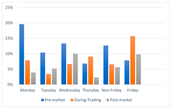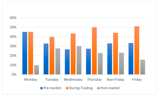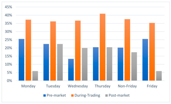 The data sample is presented in Figure 1. The number of pre-market announcements for the full sample declined during the week, with 45.10% of the announcements being made on Monday and 33.33% on Friday. Similarly, during-trading announcements showed an increase if we compared Monday and Friday, with a percentage of 45.10% and 50.98%, respectively. However, for the rest of the days of the week, there was a decrease in announcements on Tuesday, but an increase on Wednesday and on Thursday, with values of 39.66%, 43.33%, and 50.00%, respectively. Regarding the post-market period, the number of announcements on Monday was lower than on Friday, with 9.80% and 15.69%, respectively. One announcement was made in the post-market period of a pre-holiday Thursday. Therefore, the event day associated was on Monday. We reclassified this announcement as taking place in the post-market period of Friday. The rest of the days of the week presented a similar behavior, and four announcements at the weekend were considered to be Friday’s post-market announcements.