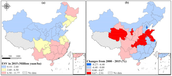 In the present study, we evaluated the ESV in China from 2000 to 2015. We found that the evaluated ESV was 28.09 trillion yuan (at the price of 2000) in 2015. One important finding in the present study is that only the western region exhibited a steady growth during the 15 years, while the eastern, central, and northeastern regions showed dramatic declines after 2005 according to the spatial–temporal changes in ESV. On the one hand, our results demonstrated that the major ecological protection projects were highly effective in the western region, e.g., the Grain for Green Project. On the other hand, rapid urban expansion in the mid-eastern region has encroached on a great deal of natural or semi-natural land, resulting in significant declines of the ESV in these areas. Therefore, in the future, more ecological conservation projects should be initiated and strengthened in the western region [