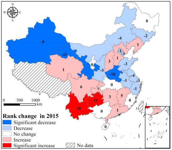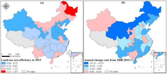 Figure 2). Land-use change is one of the most prominent features of urbanization, which directly or indirectly affects the supply of ecological service. Therefore, the consideration of the ESV is highly essential when evaluating regional land-use eco-efficiency. In addition, an interesting finding is that some provinces with declining ESV showed eco-efficiency improvement. Beijing, Tianjin, and Shanghai were typical examples (cf.