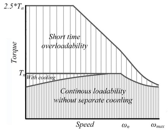The rotor design of SynRM lacking bars and magnets leads to cold rotor operation. As a result, SynRM has praiseworthy loadability, particularly at lower speeds [44]. This motor can be loaded up to 2.5 times higher than the nominal torque [45]. This breakout torque is accessible for a short period on account of a cold start. Figure 1 presents the loading capability of an industrial SynRM versus speed [45]. As can be seen, there is a wide speed operation range for the motor with continuous loading capability with no need for separate cooling. To increase the torque density, a combined star-delta winding layout can lead to 5.2% higher torque density over the conventional star case in rated conditions [46].