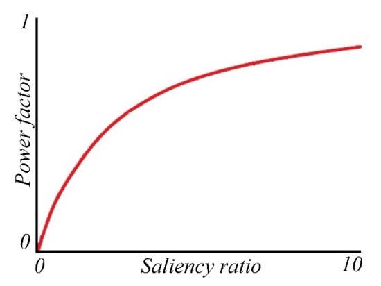 On the other hand, SynRM suffers from some severe drawbacks. In this technology, the power factor is quite low [51]. The maximum power factor of SynRM depends on the saliency ratio. The definition of the saliency ratio and power factor can be found in Reference [52]. Figure 2 gives information about the power factor improvement in terms of saliency ratio change in a typical SynRM. In this sense, the higher the saliency ratio the SynRM has, the higher the power factor the motor can provide. A sophisticated design of a laminated anisotropic rotor is proposed in Reference [53], which can increase the saliency ratio and as a result, improve the power factor and torque density. In this study, to control flux paths, some cut-offs are applied in the laminations, which influences the direct and quadrature axis inductances. This proposal leads to power factor improvements. This strategy preserves all the benefits of the motor. However, the recent improvements by these approaches are negligible. The interaction between the spatial harmonics of MMF and the rotor geometry causes considerable torque ripples in SynRMs [54]. High torque ripples and as a consequence, the acoustic noise of these motors, have become a challenge, which persuaded considerable effort to cover this drawback in both design and control aspects [5,55,56,57,58,59]. Some research works address the reduction of the torque ripples through optimization of the rotor structure [60,61]. Among proposed design solutions, rotor skewing can halve the torque ripples of SynRM, and asymmetric rotor flux barriers decrease the torque ripples to two-thirds, in both SynRM and PMSynRM [62].