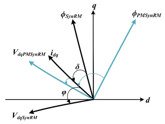 Although the SynRM avoids PMs in its structures, it sacrifices the efficiency, power factor, and torque density of the PM motors. The torque produced by SynRM is purely reluctance torque due to saliency and rotor anisotropy. This contributes to the high saturation of this motor, which limits the flux density. Adding ferrite PMs to the rotor, PMSynRM exploits the peculiar rotor characteristic of SynRM and the high performance of PMSM at the same time, as shown in Reference [63]. These motors have a desirable performance at higher speeds than base speed, fulfilling the constant-power speed range requirements [64,65]. The currents for the same torque are decreased in PMSynRM. Consequently, the losses also decline, especially for the partial load. The power factor sees a significant change of about 10% for low currents and 6% for high currents. Figure 3 shows that the voltage vectors of the SynRM and PMSynRM have different q-axis values and the same d-axis values. This leads to different values for the machines’ voltage and current angle (φ). Fluxes have the same value on the q-axis and different values on the d-axis. This can be presented as an effect of the magnets, which affects the torque angle (δ).