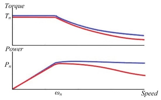 Where, denote the rated torque, rated power, and rated speed of the motors, respectively. In this figure, the torque and power output versus the speed of a typical SynRM and a PMSynRM in the same power and speed range is depicted. The figure demonstrates the enhancement of the torque and power of the motor due to the inserted ferrite PMs, particularly in the high-speed operation of the motor.