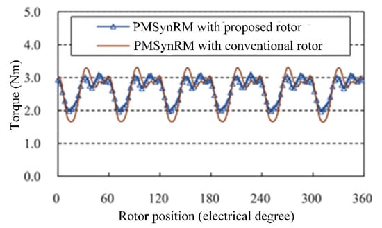 The experimental results show that the motor with the proposed structure performs roughly the same output torque ability. Besides, regarding the higher anti-demagnetization ability of the PMs, the proposed motor structure presents 35% less torque ripple in comparison with the motor with the conventional structure. The output torque of the proposed motor and the conventional motor is presented in Figure 7. The figure shows almost the same average torque and less torque ripple for the proposed structure.