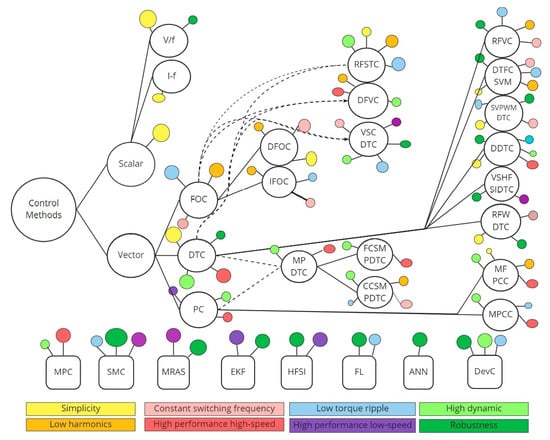 Figure 8 demonstrates the classification of motor control methods. In this diagram, all the methods, which are more specifically applied for motor control systems, are depicted in round shapes. The general control theories are demonstrated in square shapes below the motor control methods. Finally, at the bottom of the diagram, different features of the control method are demonstrated in rectangular shapes with different colors. Each color represents a specific feature showing the strength of each method in different terms. The highlighted features of each control method are demonstrated as bubbles in specific colors. The size of each bubble implies the significance of the feature in the method. The bigger the bubble of each color, the more significant feature the method has in that area. With the concept in this figure, the drawbacks of the methods can also be interpreted. For instance, the most significant advantages of FOC are its low torque ripples in the motor shaft and low harmonics in phase currents. These two advantages of the FOC method are shown in the FOC block as bubbles. Also, FOC has a constant switching frequency, which is shown in its block, as well. On the other hand, as compared to other control methods, FOC has a high computation burden for the microprocessor, which is known as a shortcoming for this method. Therefore, there is no bubble in the same color as the block for simplicity. The abbreviations are presented in the text.
