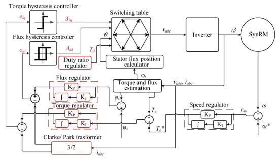 The active voltages ( are defined in DTC through Equation (1). It should be noted that, since the rotor position is synchronized with the flux, in the encoder-based DTC, the sector of the rotor flux with respect to phase a is obtained through the encoder. A more detailed description of the DTC of SynRMs is reported in Reference [128]. Figure 11 shows the block diagram of the conventional DTC of SynRM.