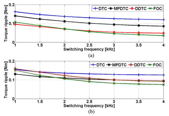 A comparison of torque ripples of different control methods in different switching frequencies under zero load and (a) 500 r/min, (b) 1000 r/min [129].
