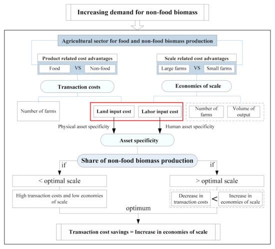 In the present study, transaction costs are defined as the costs (and hence the inefficiency) of structural adjustments due to the engagement of agricultural producers in non-food biomass production (Figure 1). In order to lay bare the interaction mechanism of transaction costs and economies of scale as a combined effect on the optimization decision in highly competitive industrial agriculture, the analysis framework is deliberately reduced. Two types of asset specificities, human and physical asset specificities, which can significantly affect both production and transaction costs and as a result also the economies of scale [72], are considered. Thus, it excludes a number of important factors, such as price, volatility, competing land use, etc., which necessarily would influence this mechanism. In this stylized setting, non-food biomass producers optimize the scale of operations by trying to economize on transaction costs and improve production efficiency. The optimal farm size at the minimum transaction costs depends on the costs associated with the inability to run equipment below a certain labor input [45,54]. This implies that, in the case of diseconomies of scale, an increase in production costs can offset the benefits from the transaction cost savings associated with changes in asset specificity.
