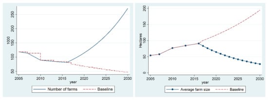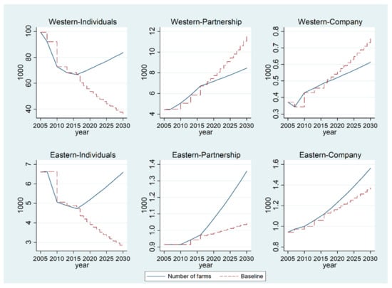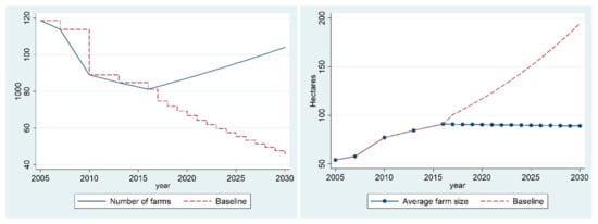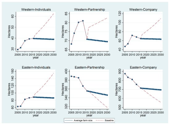 Average farm size within the ownership types correspondingly declines (Figure 7). Specifically, the average farm size decreases by 0.14% in western Germany and at a slightly higher rate (0.20%) in eastern Germany (see Figure 7). The declining average farms size both in eastern and western Germany indicates the prospects for smaller producers with regard to agricultural development [37]. In particular, the difference between the baseline and projected dynamics for western Germany is greater than that for eastern Germany. This might be caused by the decreasing returns to scale in western Germany, as shown by the adjusted production function in Table 1. To meet the increasing demand for non-food biomass, producers in western Germany largely adjust the combination of investments in land and labor. Thus, the higher the transaction costs saved, the smaller the optimal farm size, supporting the studies that observe a U-shaped function of asset specificity [66,67].