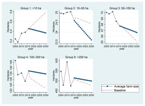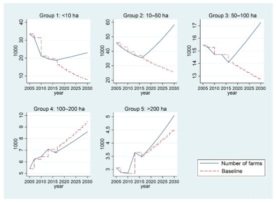 The optimal average farm size (Figure 5) declines in response to a higher demand for non-food biomass in each group, namely by 0.12%, 0.30%, 0.12%, 0.14% and 0.21%, respectively. The comparison with the baseline trend reveals that the effect of transaction costs economization is particularly strong in Groups 1, 2 and 4. The difference between the baseline and projected dynamics in Group 1 and 2 can support the argument that transaction cost savings in competitive industrial agriculture can help small farms realize the supervision and local infrastructural advantages [8,40]. While, the observed gap between the baseline and projected dynamics in Group 4 is mainly caused by a lower growth rate in farm number compared to its corresponding baseline. Given that the technological (and hence the productivity) level remains unchanged, producers respond to increasing biomass demand by readjusting their input–output combinations. For instance, the adjusted production function in Group 5, as shown in Table 1, changes from increasing returns to scale to decreasing returns to scale. In this case, the largest farms adjust their optimal size less compared to both the other size groups and the baseline.
