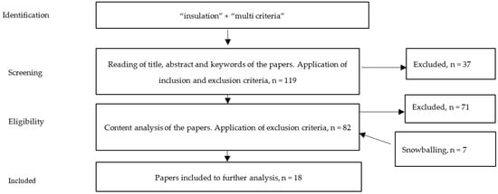 Content analysis was performed for the 82 articles found in the search. A snowballing method was also applied. Therefore, content analysis was performed for other articles that were not found during the search. Seven additional papers were found. A total of 18 relevant scientific studies were found where different MCDM methods for insulation materials were applied. A flow of information is provided in Figure 1.