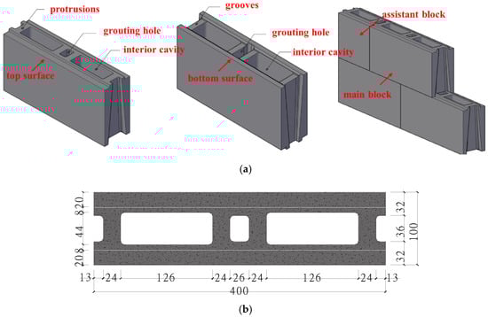 However, there are few studies reported on the use of recycled aggregate in interlocking hollow block for building construction, which is disappointing for the promotion and application of recycled concrete block masonry structures. Comprehensively considering the advantages of interlocking hollow blocks and the utilization of recycled aggregate, a new type of interlocking hollow block totally using recycled aggregate concrete (IHB-RAC) with compressive strength about 10 Mpa was proposed. Through the construction competition test of two middle-skilled workers to build the wall with the dimension of 1600 mm × 1600 mm (width × height) by using both the IHB-RAC block and the traditional concrete hollow block, the IHB-RAC block could help improving more than 56% of the construction efficiency (as the times used were about 11 min and 26 min respectively for the IHB-RAC masonry wall and the traditional hollow block ones). And, in order to avoid straight joint, the IHB-RAC was made into two different types of dimensions, called as main block and assistant block (as shown in Figure 1a). The specific dimensions of the main block are shown in Figure 1b,c, as the width is 400 mm, the thickness is 100 mm, the height is 200 mm. The width of the assistant block is half of the main block (200 mm), and the other dimensions are the same as the main block. On the whole, the shape of the hollow block is rectangular with a cavity rate of about 42%, and there are two big cavities inside, which could save the use of materials and make a positive contribution to the self-insulation and energy conservation of buildings. Between the two big cavities, there is also a small grouting hole inside, and the overall mechanical properties of the masonry using IHB-RAC could be further strengthened by pouring concrete inside the small holes. Above all, combining with the use of mortar, the protrusions and grooves on the top and bottom surfaces of the blocks acting as connecting keys could provide an effective connection while assembling them together into a wall. In order to promote the application of this new type block in building engineering, the compressive and shear properties of the masonries considering different mortar grades and the concrete used in the grouting holes were tested and studied.