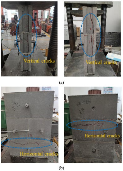 Through comparison, increasing the mortar grade and using grouting hole concrete had little effect on the failure mode of the specimens. In general, there are two main failure modes of the masonry, as double-surfaces shear failure (shown in Figure 5a) and single-surface shear failure (shown in Figure 5b), and the failure cross-sections are shown in Figure 5a,b. Most of the test specimens showed double-surfaces shear failure, indicating that the shear strength of the two mortar shear joints of the test masonry were almost equal. This was because that the interlocking keys of the block could provide an excellent connecting function, which could avoid the big differences between the mortar joint strength caused by the uncertainty of the construction level as well as the uneven distribution of joint mortar. Nevertheless, only a few of the test specimens using grouting hole showed single-surface failure, which could mainly be attributed to the uniform shear force applied to the joints by the loading device. However, it could be observed that the joint mortar of the unseparated shearing surfaces had already cracked throughout the whole cross-section; but the interlocking keys and the grouting hole concrete had not been sheared off totally, further indicating the excellent performance of the masonry.