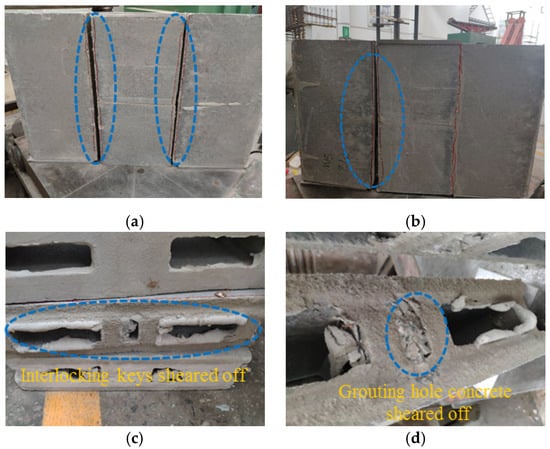 Shear failure mode of specimens. (a) Double-surface shear failure; (b) Single-surface shear failure; (c) Shear cross-section (ungrouted); (d) Shear cross-section (grouted).
