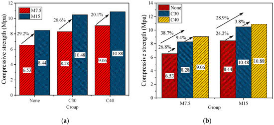 Comparison of the compressive strength of specimens (mean value). (a) Comparison under different mortar strength; (b) Comparison under different strength of grouting hole concrete.